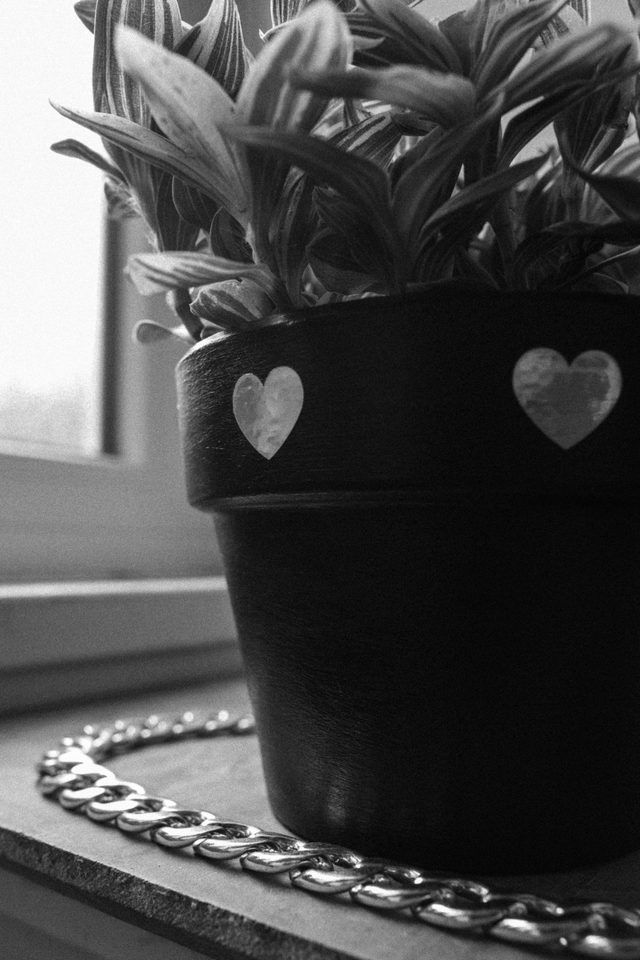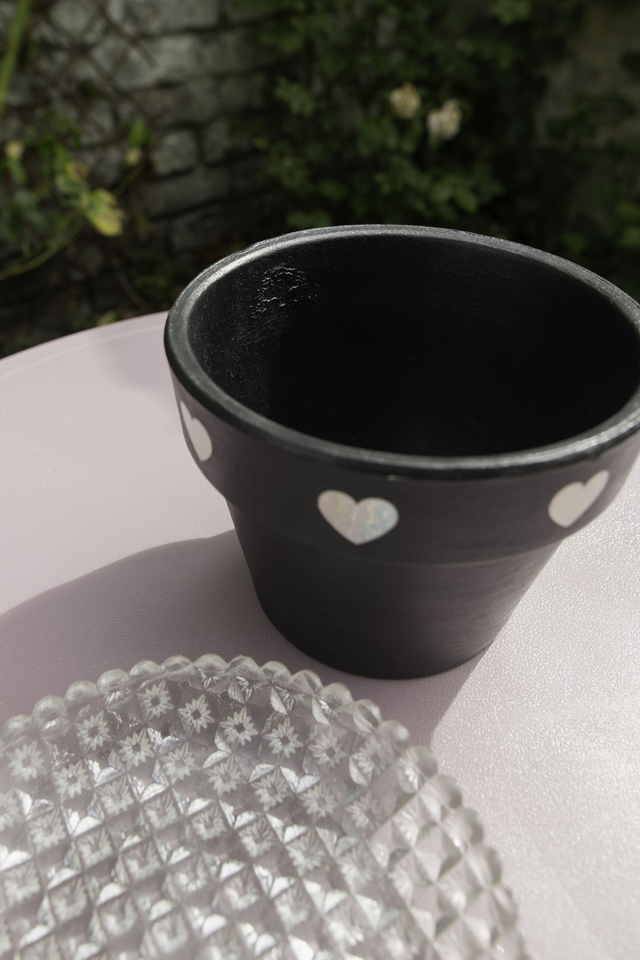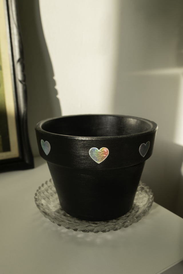 Un mood Kit qui associe une plante lumineuse à un pot noir orné de cœurs holographiques, entre ombre et féérie ✨