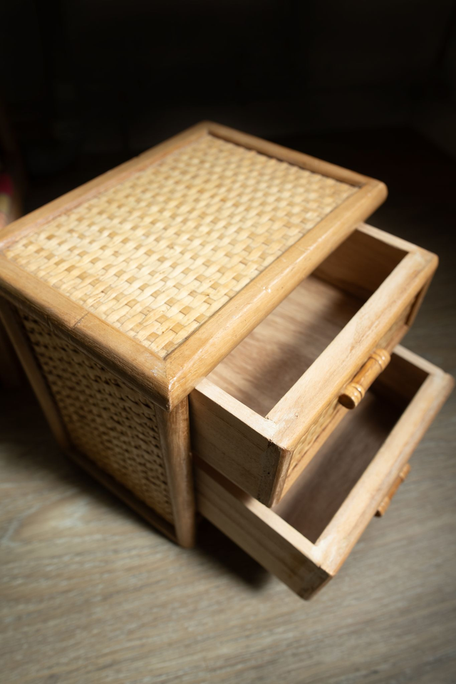 Un petit meuble tressé en bois clair à deux tiroirs, prêt à accueillir tous tes objets secrets… Il contient déjà un petit bonus caché 🎁